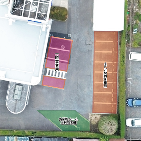 ※コワーキングスペースご利用者様は入り口側の駐車場をご利用ください。詳しくはお問い合わせください。