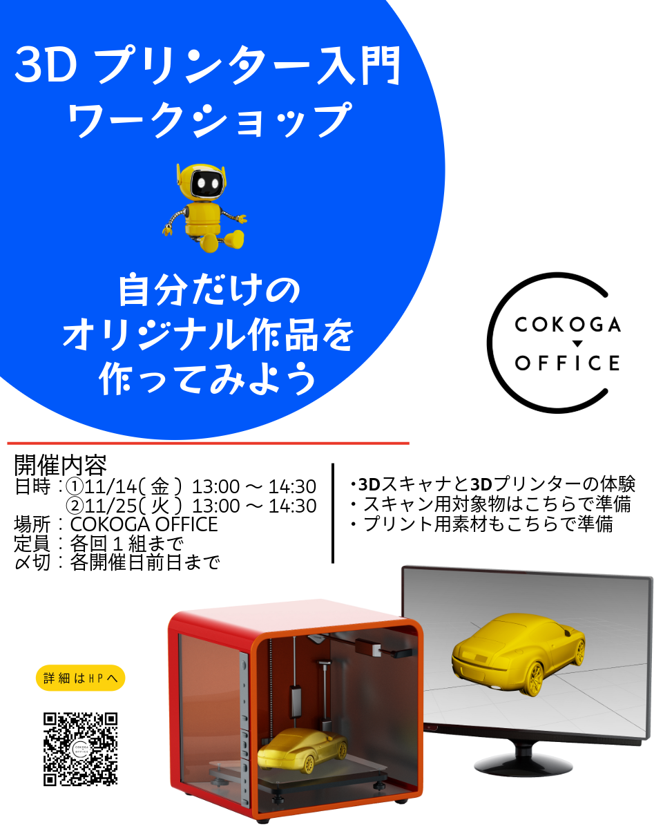 COKOGA OFFICEでは、そんなイメージをガラリと変える3Dプリンター体験ワークショップを開催します!